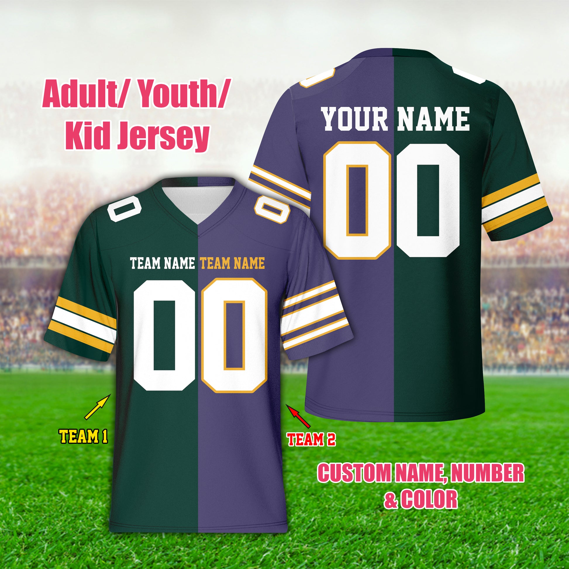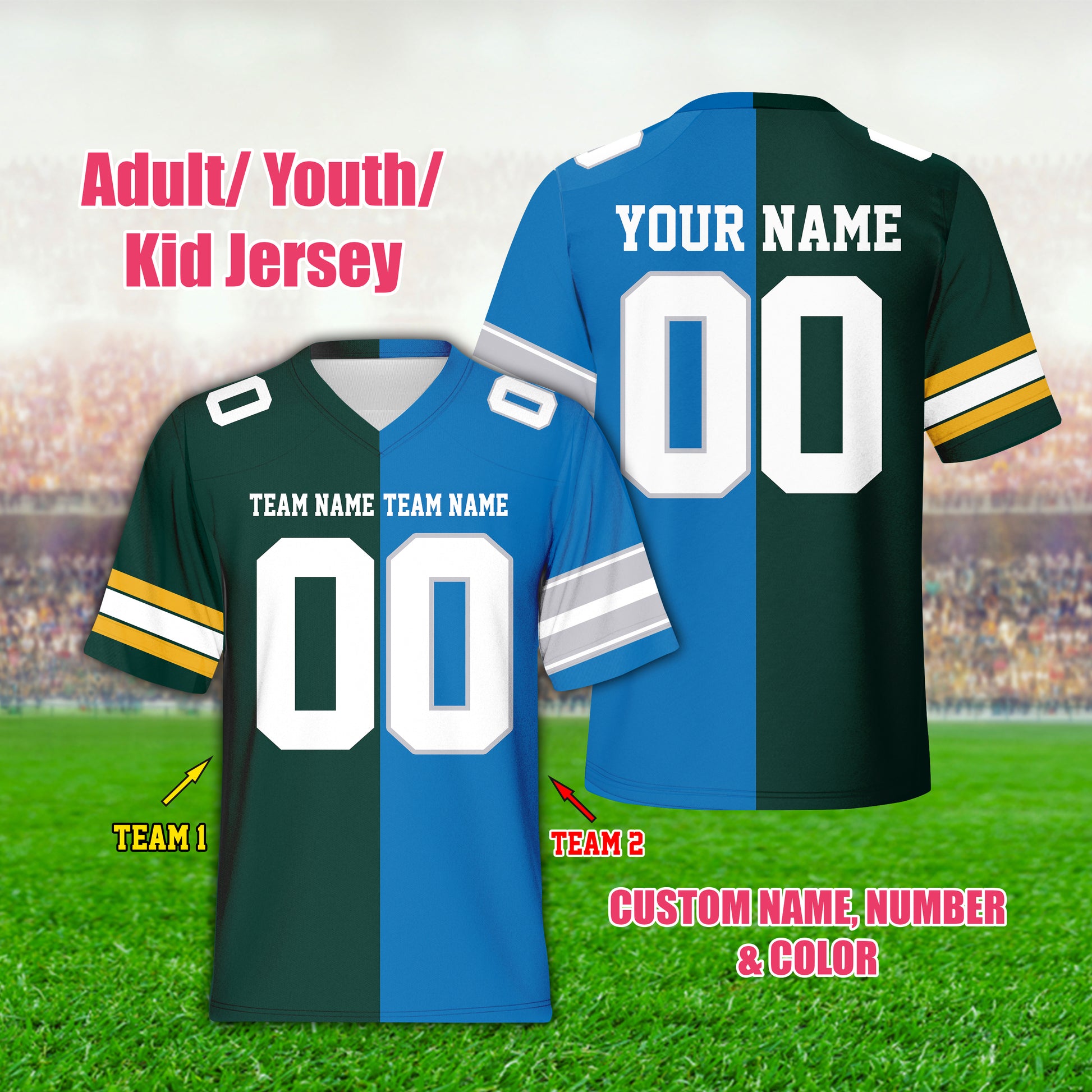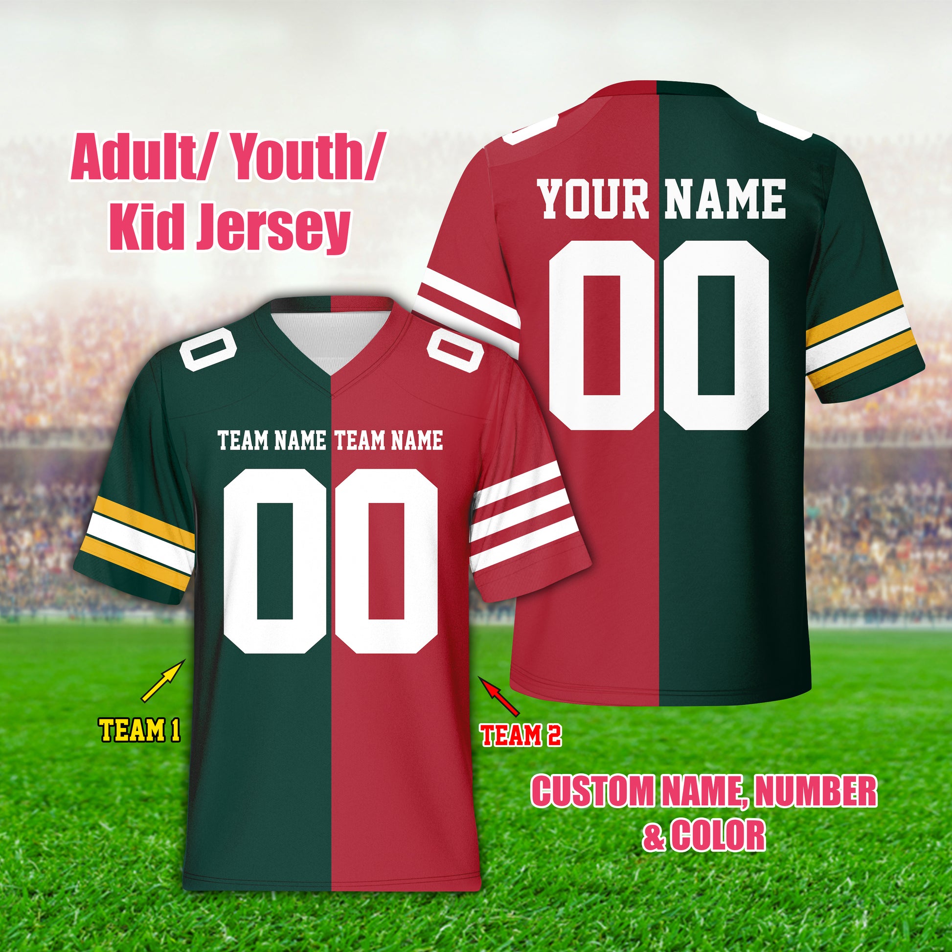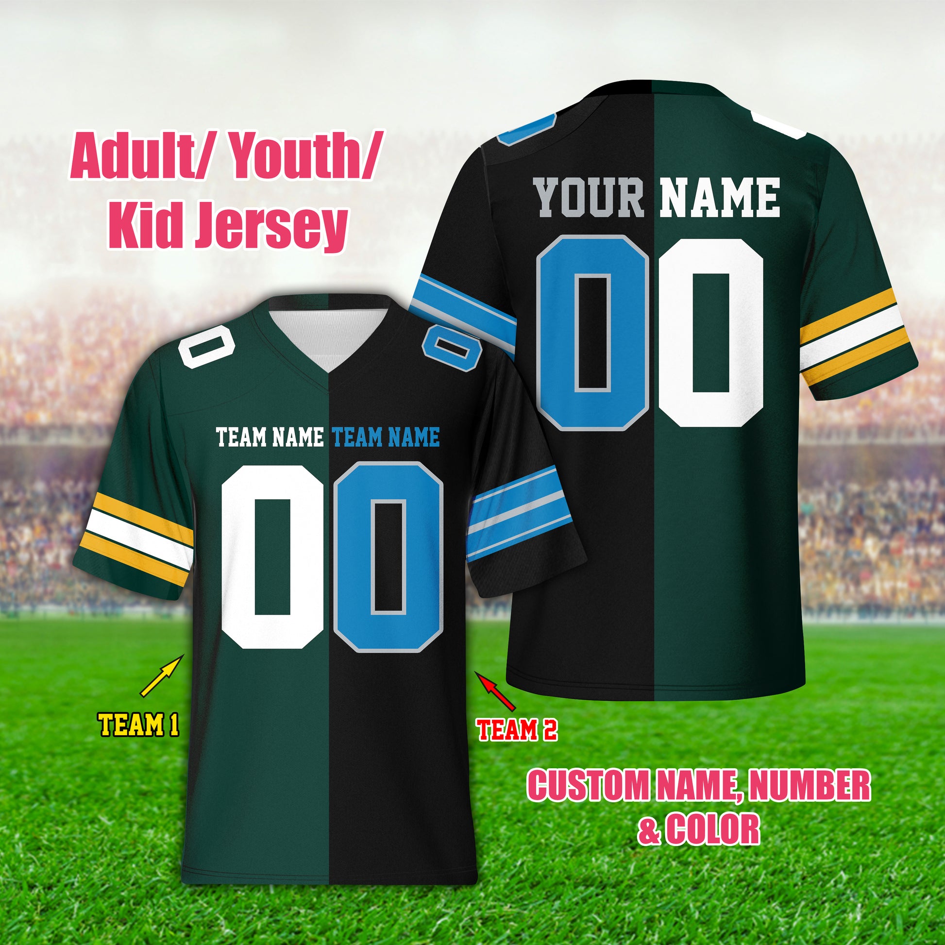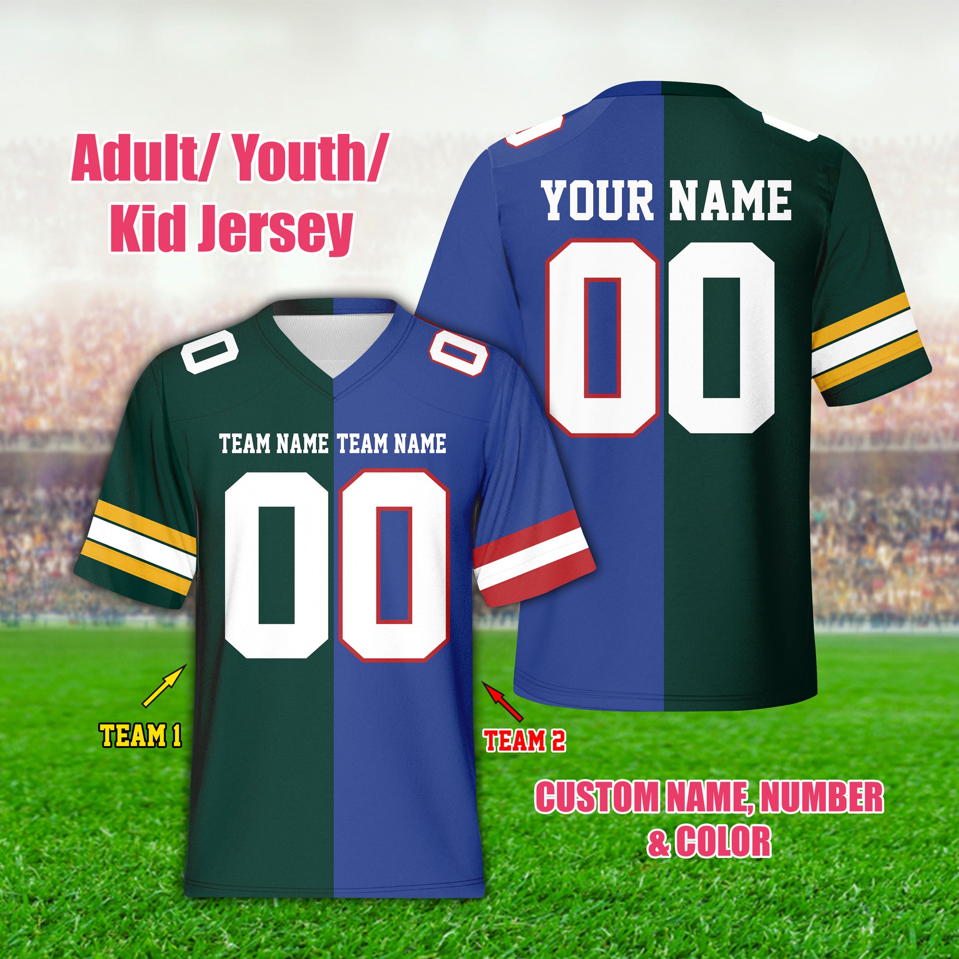 Suit up like the pros. This customizable American football jersey comes in classic team colorways with bold shoulder patches and sleeve stripes. Personalize the Team Name, Player Name, and Number on front/back., Color. Available for Adults and Kids/Youth so the whole squad matches for game day, photos, or gifts.