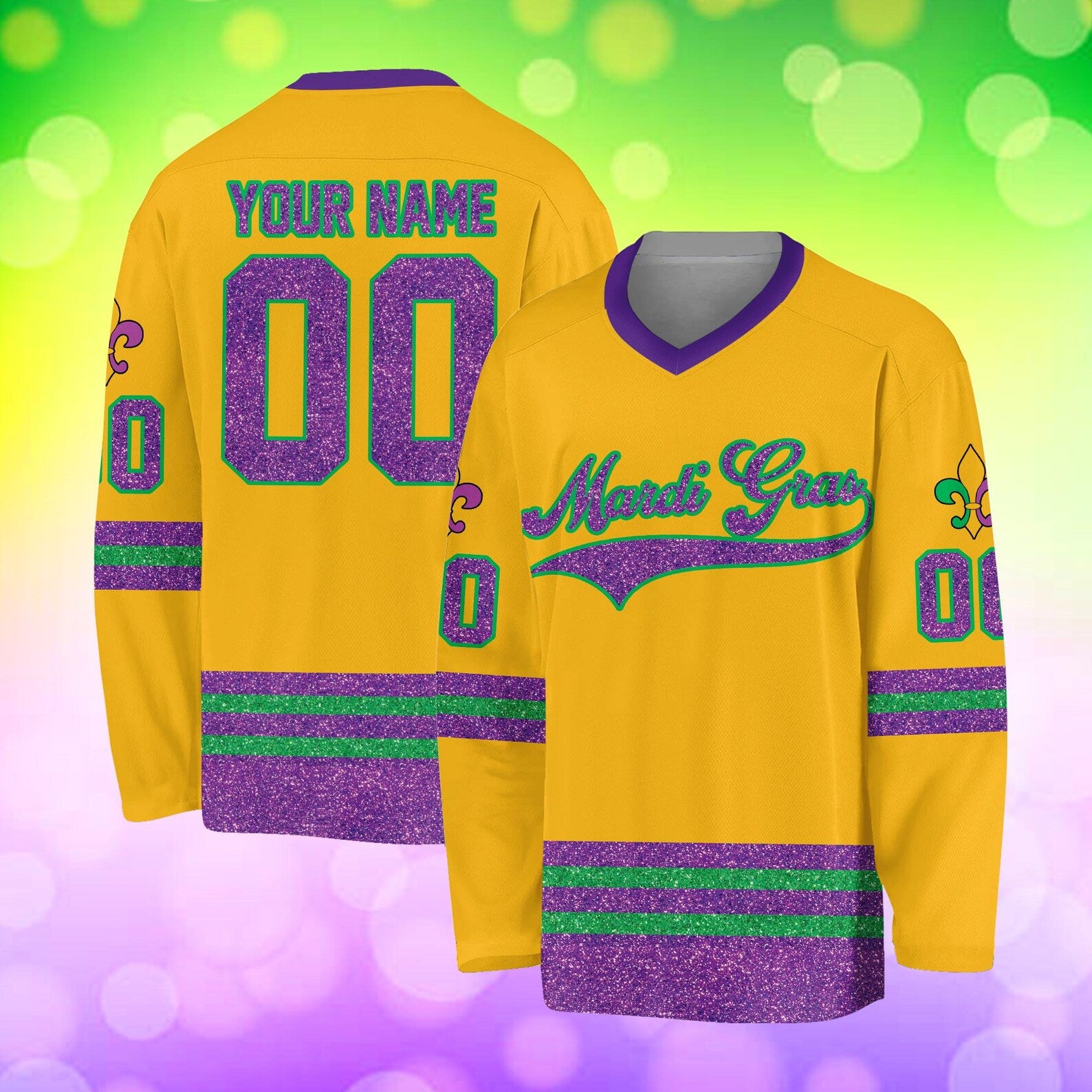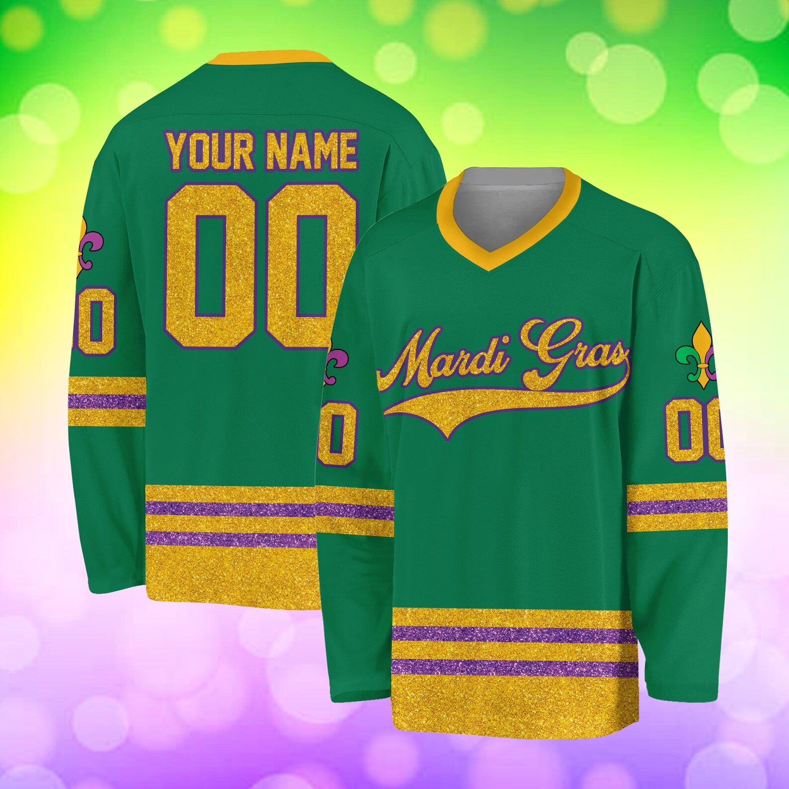 Bring the parade vibes to the rink! Our Mardi Gras Hockey Jersey features the iconic green–purple–gold palette with a printed glitter effect that shines without shedding. Personalize it with your name and number to match your crew or team.